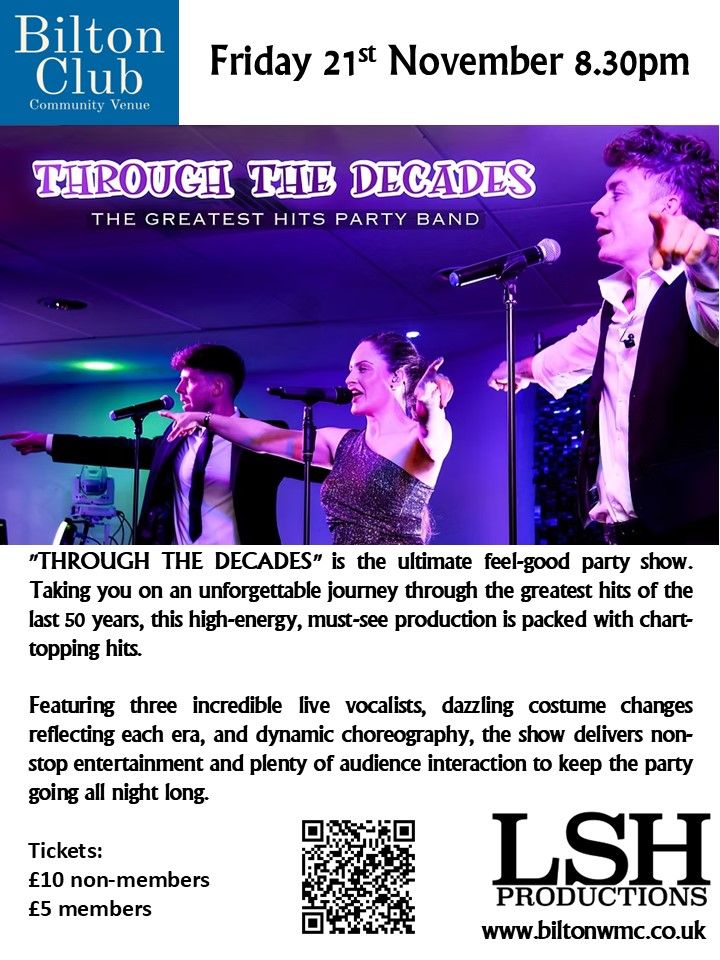 Enjoy a fantastic evening of live entertainment with Through the Decades, performing classic hits from the 60s right through to today’s favourites. Sing along and dance the night away as the band takes you on a musical journey through the years.